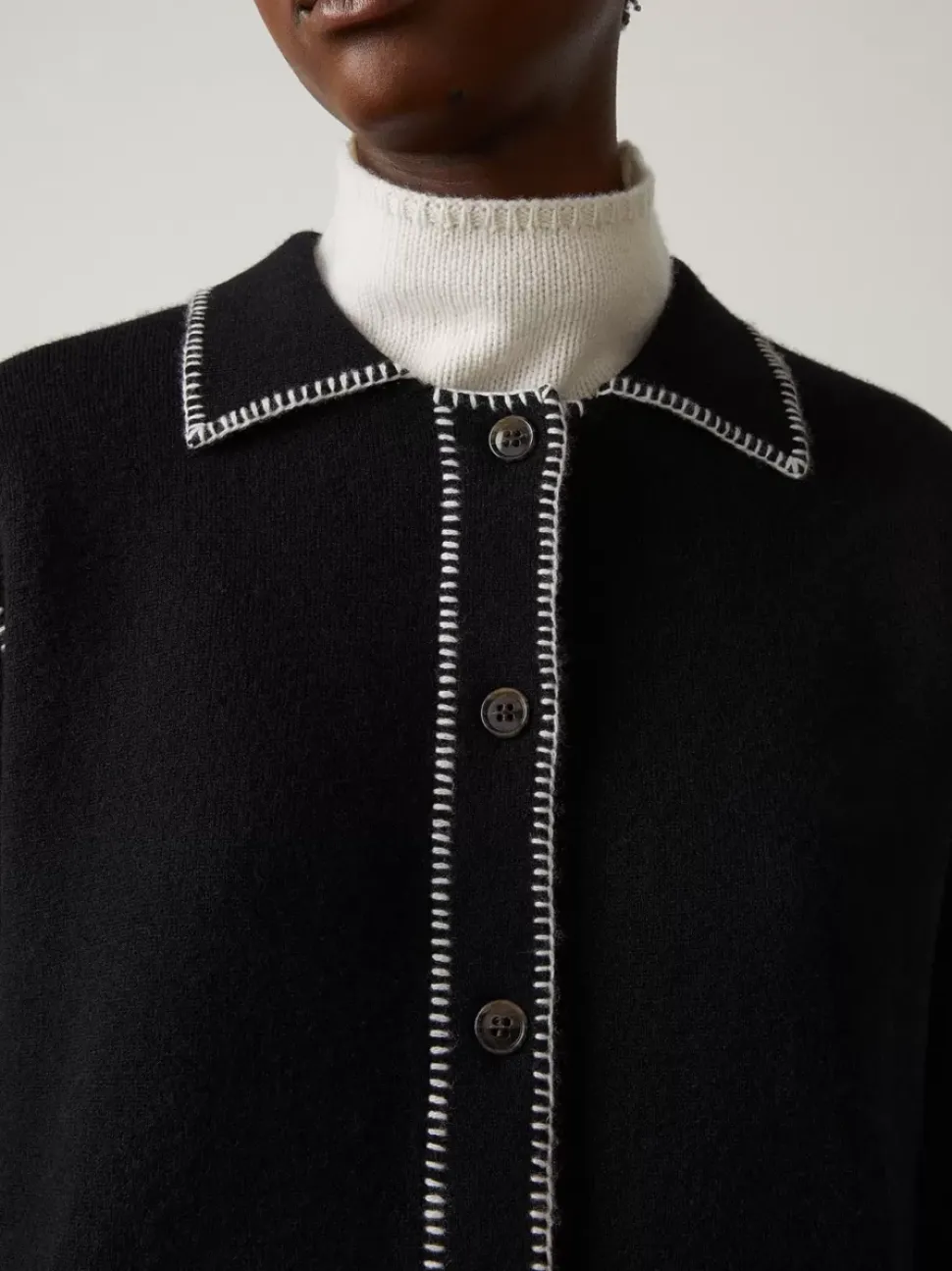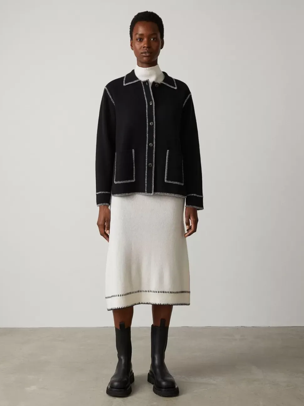 In Double-Face Cashmere, The Billy Cardigan Has Substantial Weight And Is Finished With Hand-Stitched Contrast Stitching. The Monochrome Palette Is Livened By A Button-Front Opening, Pockets And Neat Collar. Pair With The Adele Skirt For A Complete Look From The New Top-Stitch Group.