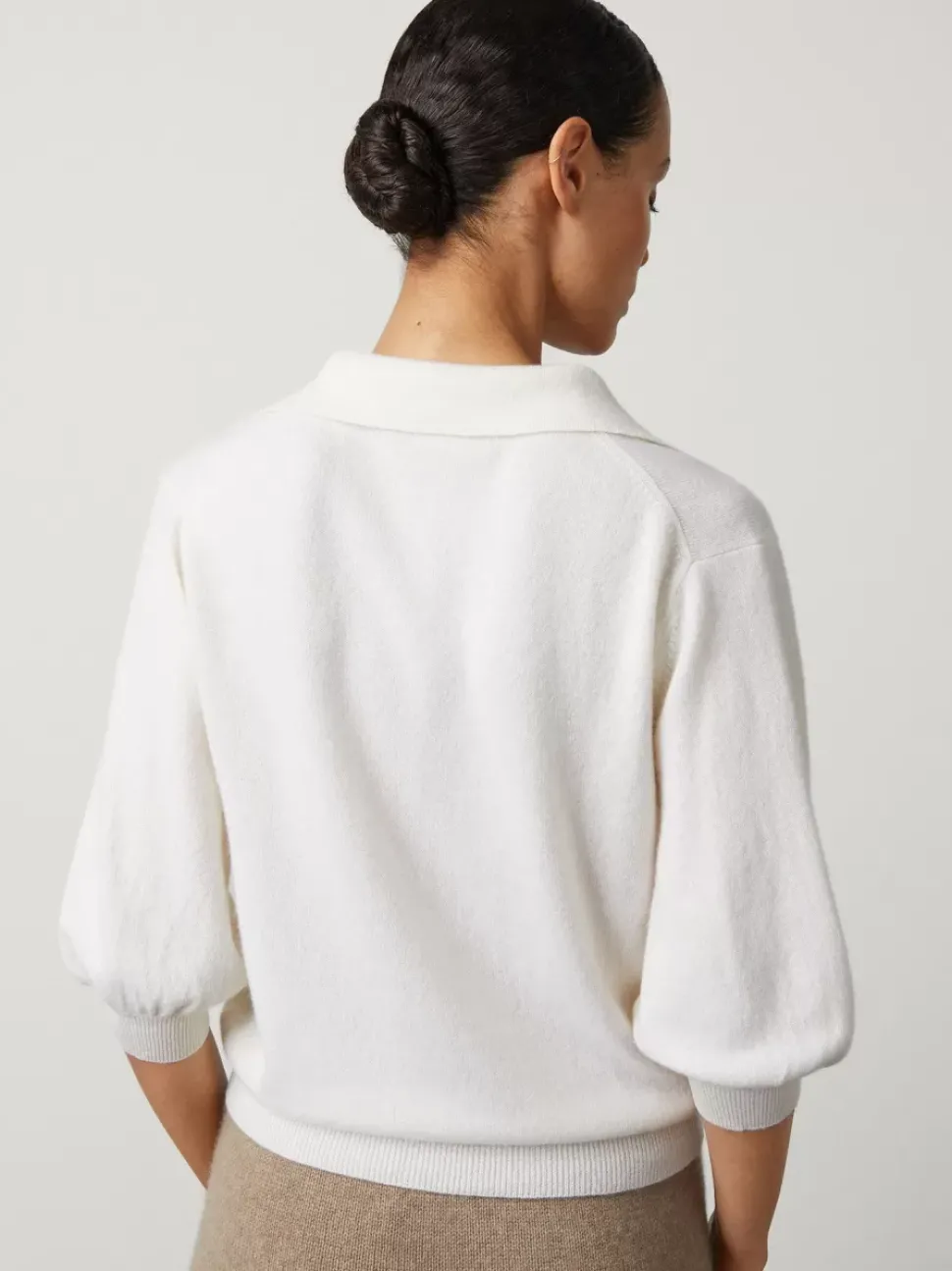 Featuring An Open Neck Polo Shirt Collar, Kimberley Accentuates The Neckline. It Is Knitted In Light Weight Premium Cashmere And Designed For A Shorter Length Fit. The Slightly Puffed Three Quarter Sleeves Provides A Relaxed Yet Feminine Look.