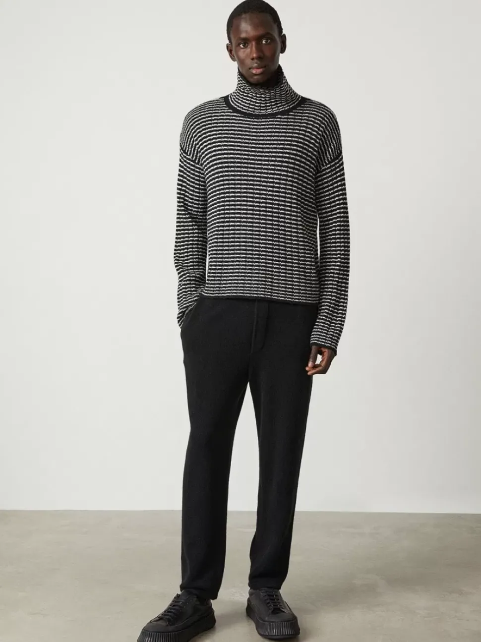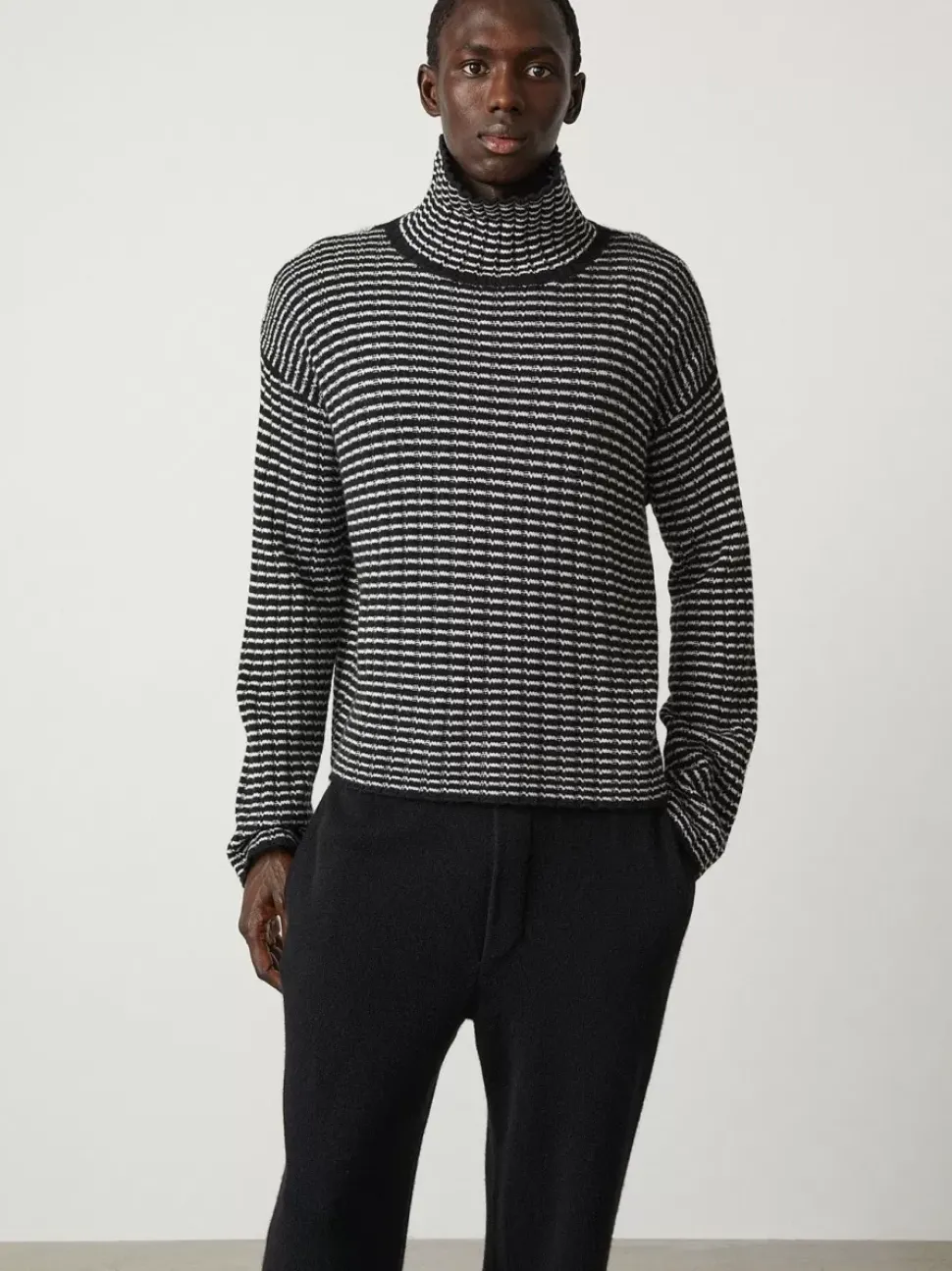 The Darcy High Neck Sweater Is A Plain Knit, Relaxed Body Silhouette With A Panel Of Neat Ribbing. The High Neck Is Also Comfortably Ribbed With A Loose Fit. The Drop Shoulders Are Balanced By A Stepped Hem With A Slightly Longer Back Than Front.