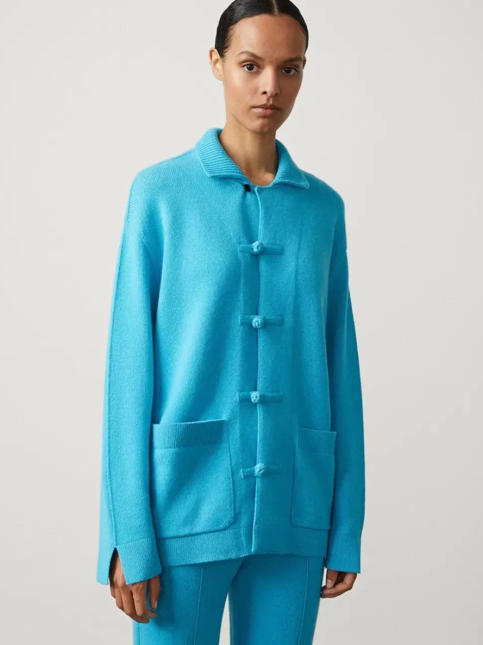 New In, The Longline, Plain Knit Bryson Jacket Displays Its Craftsmanship In A Substantial 7 Gauge Cashmere. It’s Detailed With A Frog Button Down Feature With A Nod Towards The Brands Eastern Heritage. A Contrast Rib Collar And Split Cuff Keeps A Modern Appeal.