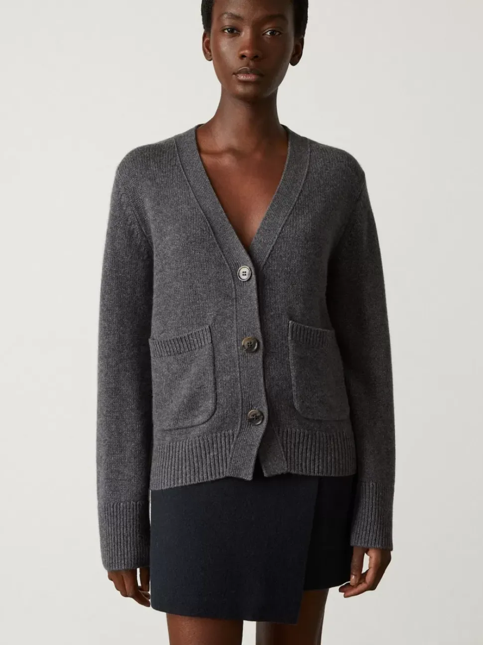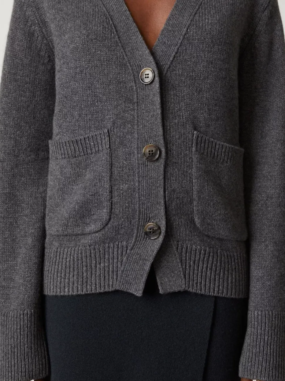 Accentuated By Patch Pockets, Ribbed Trims And Dropped Shoulders, This Deep V-Neck Cardigan Is Designed To Be A Cherished Permanent Wardrobe Staple. The Extended Sleeves Creates A Feminine Yet Elevated Look.