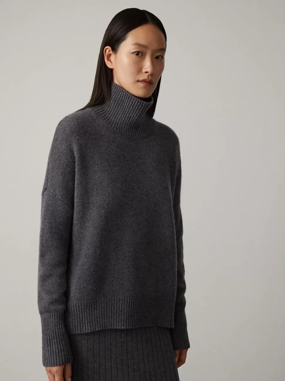 This Plain Knitted Sweater Is Contrasted By A Ribbed Neck, Cuffs And Hem. The Standing Ribbed Roll Neck Is Balanced With Dropped Shoulders And A Relaxed Silhouette, Making Heidi The Perfect Wardrobe Staple.