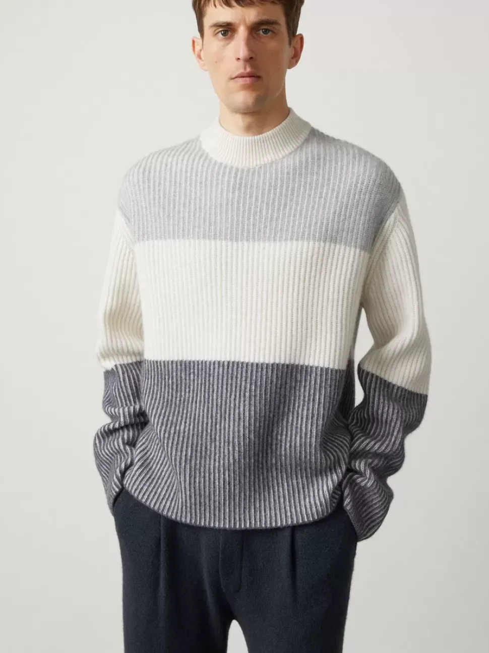 The Julian Sweater Features A Ribbed, Rounded Mock-Neck That Extends Into A Colour-Block Body. The Sleeves And Hem Are Unfinished For An Uncomplicated Detail And With Dropped Shoulders.