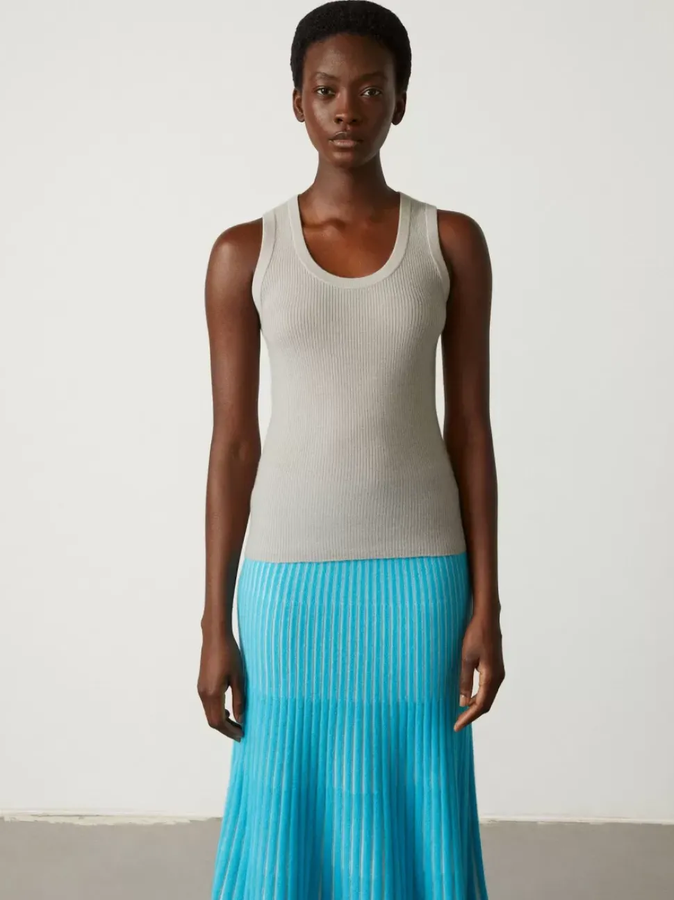 The Devyn Tank Top Is Finely Knitted In A 16 Gauge Ribbed Cashmere And Designed To Fit Close To The Body With A Round Neck And Elegant Curved Armholes To Accentuate The Collar Bone. Banded Trims Give A More Dressed Look Whilst The Rolled Hem Allows For Wear Tucked In And Out Of Bottoms.