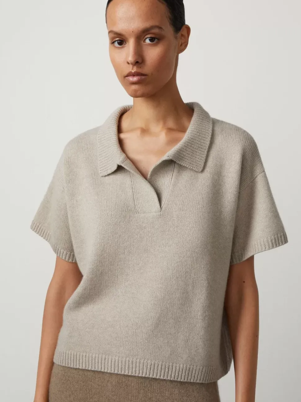 For Spring, The Bella Short Sleeve Polo Neck Is Softened In Seasonal Colour Pearl And Signature Sand. Modernised By The Drop Shoulder And Slightly Cropped Length, Its Mid-Weight Cashmere Drapes For An Effortless Stand Alone Piece.