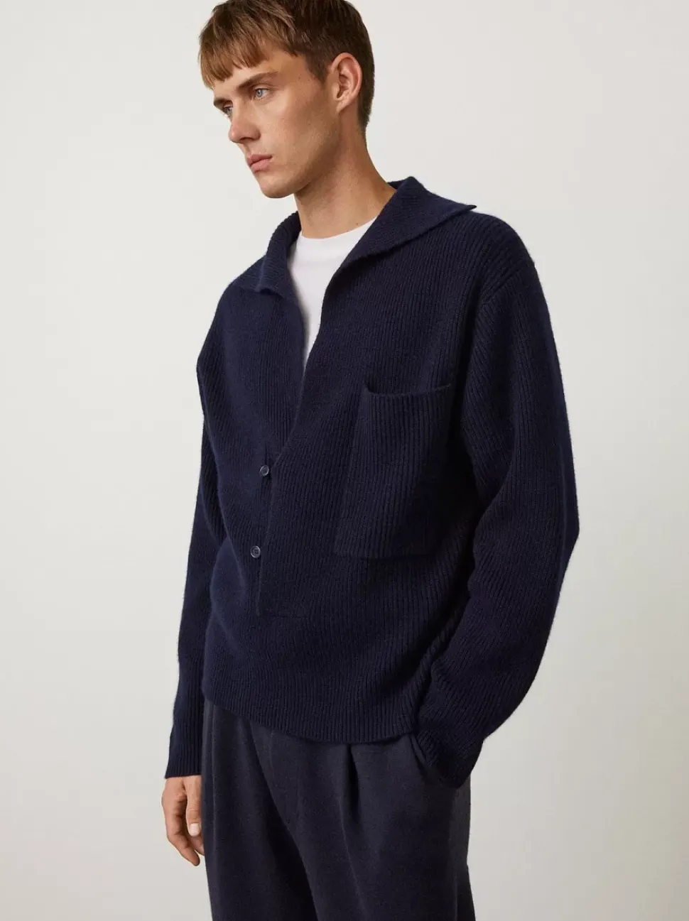 The Devereux Sweater Is Knitted In A Slim Ribbed Cashmere, Giving Comfortable Stretch Whilst Retaining Its Form. A Slight Dropped Shoulder And Front Patch-Pocket Is Balanced By Clean Trim Detailing. An Assymetric, Adjustable Collar Makes The Devereux A Unique Style For Autumn Winter.