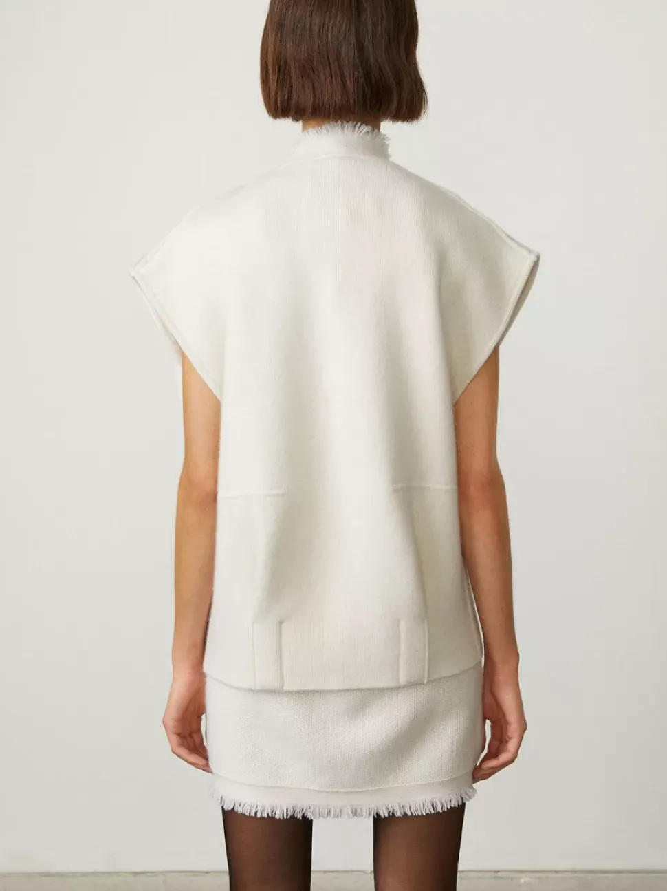 A Spring Layering Piece From The Hand-Finished, Fringe-Trim Capsule, The Lucina Vest Is Knitted In A 7 Gauge Cashmere Body And Complete With Hand-Fringed Trim. A Relaxed Fit Is Accentuated By The Wider, Broad Shoulders And Slightly Drawn Hemline. Side Pockets Add Functionality, And We Like To Layer Over The Mathilde Vest And Adela Skirt From The Sample Capsule.