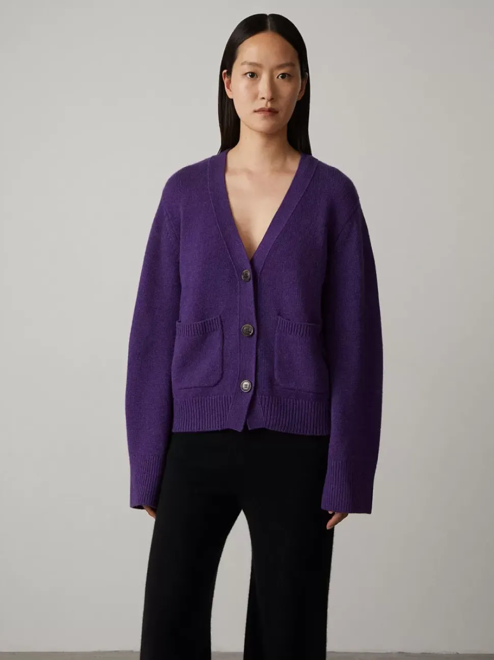 Accentuated By Patch Pockets, Ribbed Trims And Dropped Shoulders, This Deep V-Neck Cardigan Is Designed To Be A Cherished Permanent Wardrobe Staple. The Extended Sleeves Creates A Feminine Yet Elevated Look.