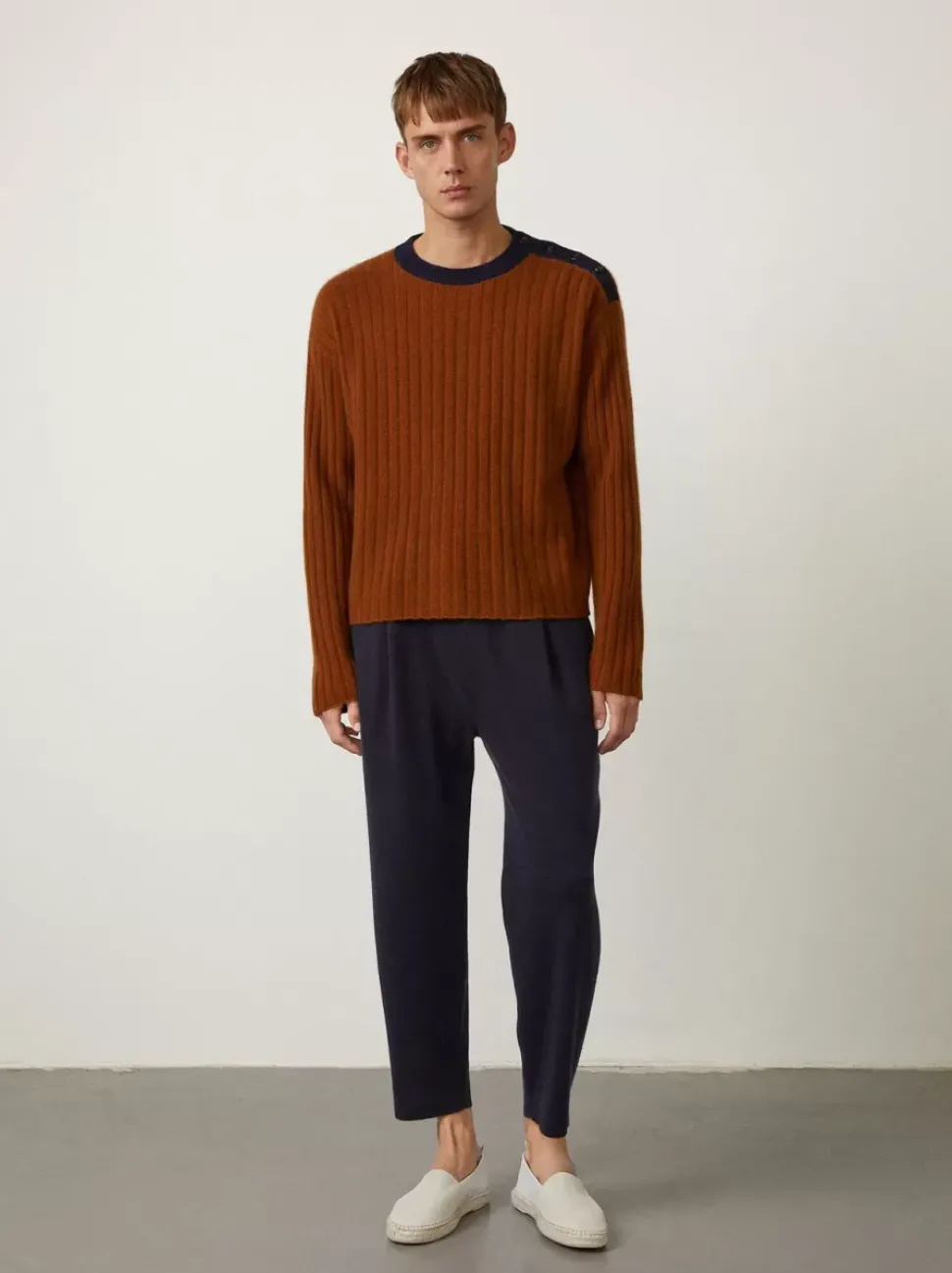 The New In Bruce Sweater Is Knitted In Our Signature Paddington-Rib Cashmere That Lends A Tactile Focus Whilst Retaining A Lightweight Feel From Its 12Gg Body. There Is Minimal Trim Detailing, Beyond The Contrast-Collar Shoulder Button Placement That Is Adjustable And Features A Contrast Colour Lining.